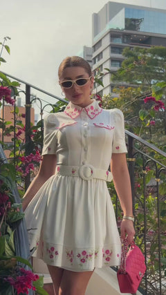 With waisted shape, embroidered collar and structured short sleeves, the model stands out for the floral industrial embroidery in pink color applied to the collar, pala, skirt bar and the belt coated with the fabric itself, which enhances the waist and brings a sophisticated finish. The viscolinho fabric ensures lightness and impeccable fit, perfect for tropical brunches, garden parties, summer outings or daytime events that call for relaxed elegance. Metal zipper on the back.