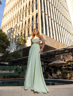 Elegant and timeless, this mint green maxi dress is designed to make a statement at any special occasion. Featuring strategic side cut-outs, the dress beautifully enhances the silhouette while maintaining a refined and sophisticated look.